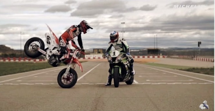 Michelin has released a rather high-budget looking video to support their newest web-based campaign; WE ARE ALL RACERS. The first episode features 2014 FIM CEV Superbike Champion, Kenny Noyes, on a Kawasaki ZX-10R and SuperMoto GP rider, Sylvain Bidart on his competition prepped Honda CRF.