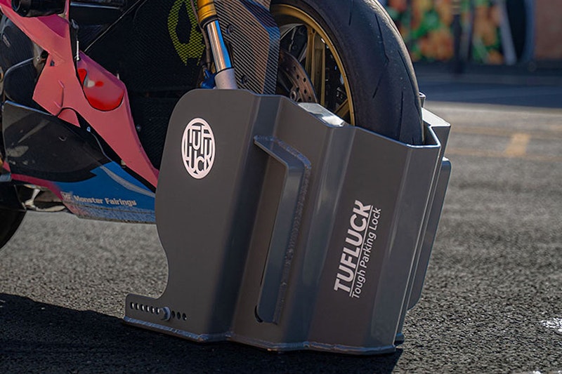 TufLuck Motorcycle Lock - A UK-made, floor-mounted security system that combines a ground anchor with a front-wheel chock to lock your motorcycle in place — no chains required.
