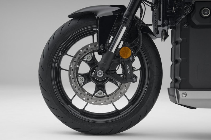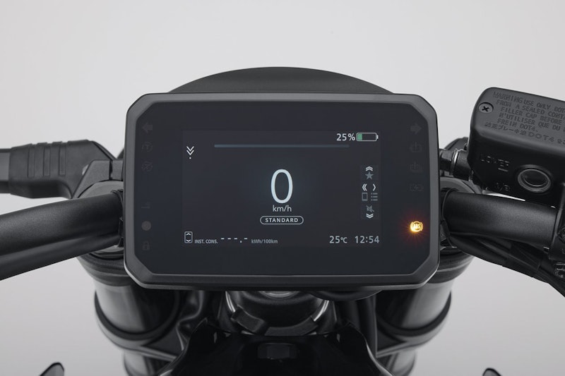 An inertial measurement unit allows for cornering traction control – easier than ever with electric power, where the torque can be modulated instantly by the control unit without having to fiddle with throttle butterflies or fuel injection delivery – as well as cornering ABS via Nissin brakes with two-piston front calipers and 296mm discs at the front and a single 256mm disc at the rear.