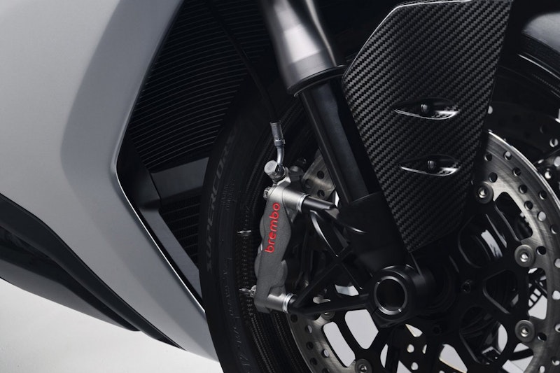 The wheels are another highlight, as despite those thin-looking spokes they’re entirely carbon fibre. Made by BST, they should help reduce inertial and gyroscopic forces to help the bike accelerate faster and turn quicker. Pirelli Diablo Supercorsa V4SP rubber is standard, with the usual 120/70-17 front and 200/55-17 rear sizes.