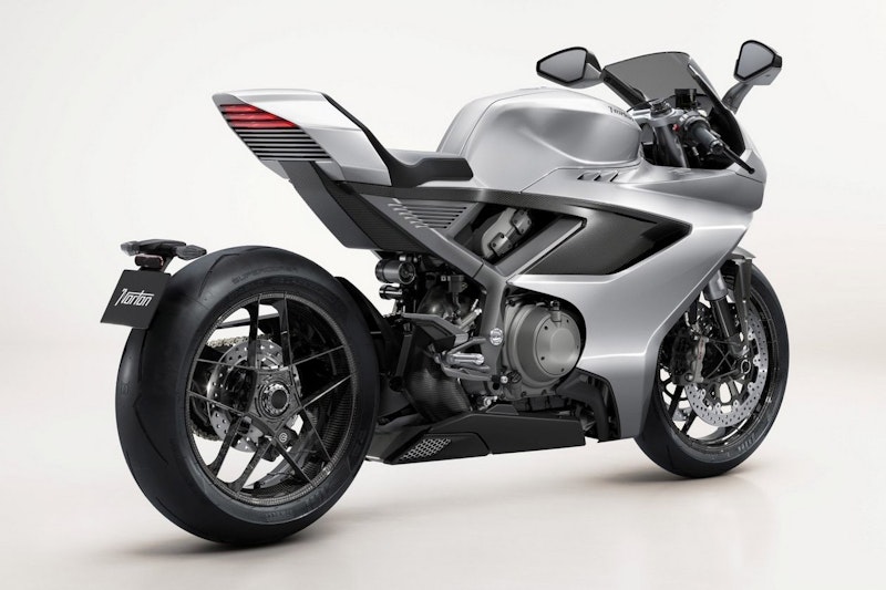 At the back, the single-sided swingarm has echoes of the previous bike’s design in its shape, with bracing hanging below rather than above the main arm, and provides a mount for the number plate, allowing the single-seat tail bodywork to be short without breaching Euro rules that demand bodywork must extend beyond the back edge of the rear tyre. To make the most of it, Norton has packaged the bike’s entire exhaust into the belly, so there’s no silencer blocking the view of the swingarm and the rear wheel.
