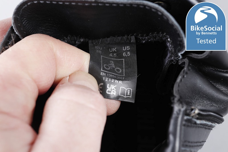All motorcycle boots sold in the UK must be certified to EN13634. There will be four numbers on the pictogram inside a boot which will either be a 1 or a 2.