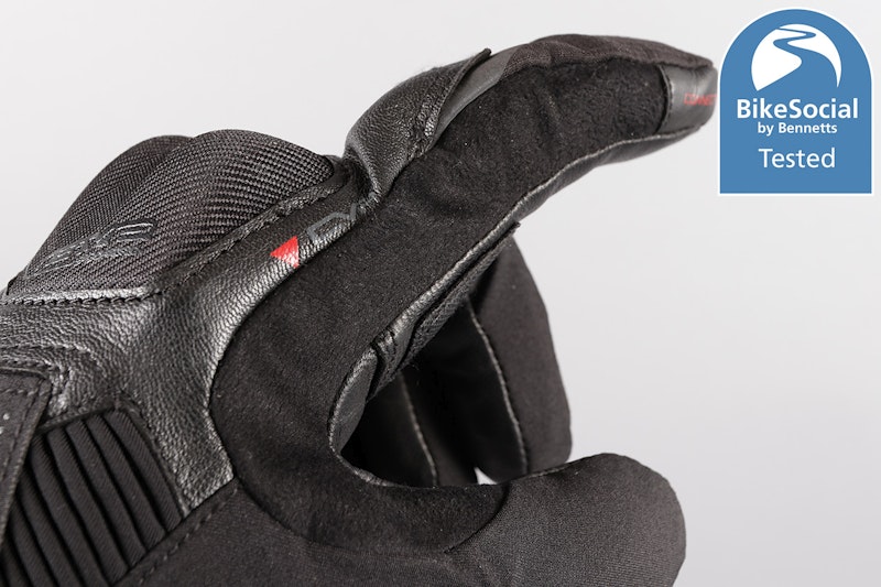 The left glove has a soft fabric visor wipe panel sewn into the inside face from the top of the forefinger to the thumb, which I’ve found very effective when swiping rain and filth from the visor.