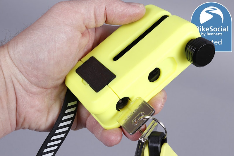 The MD1000 comes with one strap in fluorescent yellow and one in black, and the lock itself is available with a yellow or black body. Hiplok has also released the MDX, which we’ll be testing shortly and looks the same, but doesn’t have the graphene construction and is certified to the lower Sold Secure Powered Cycle Gold standard. This also doesn’t come with a carry-pouch, has just one reminder strap and is only available in black for £89.99.