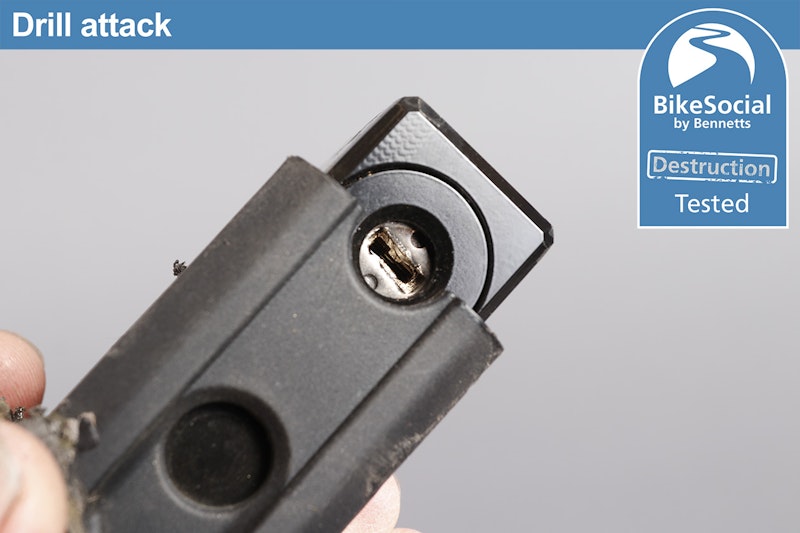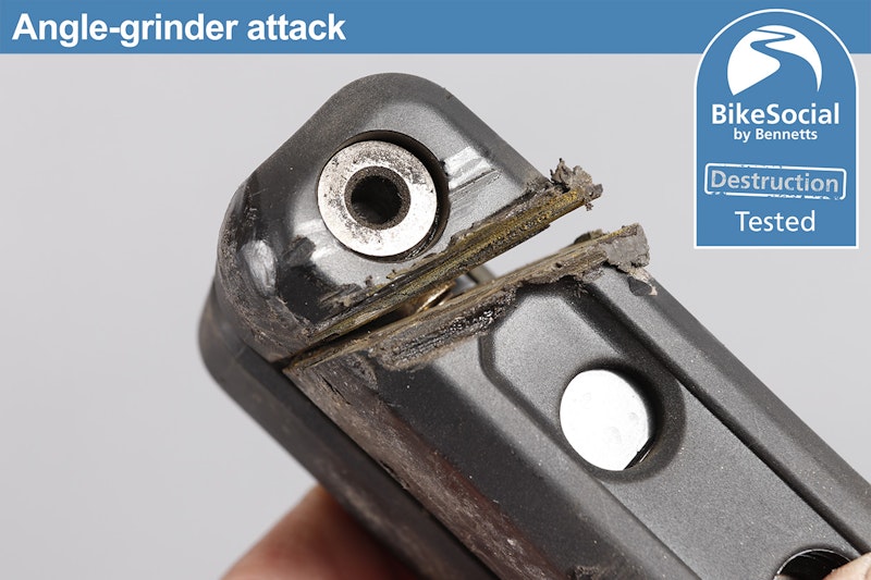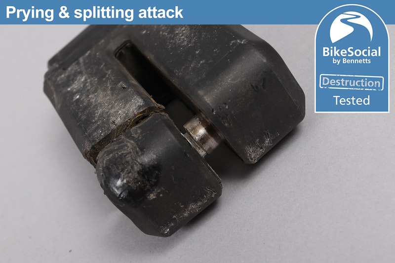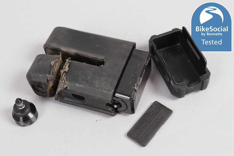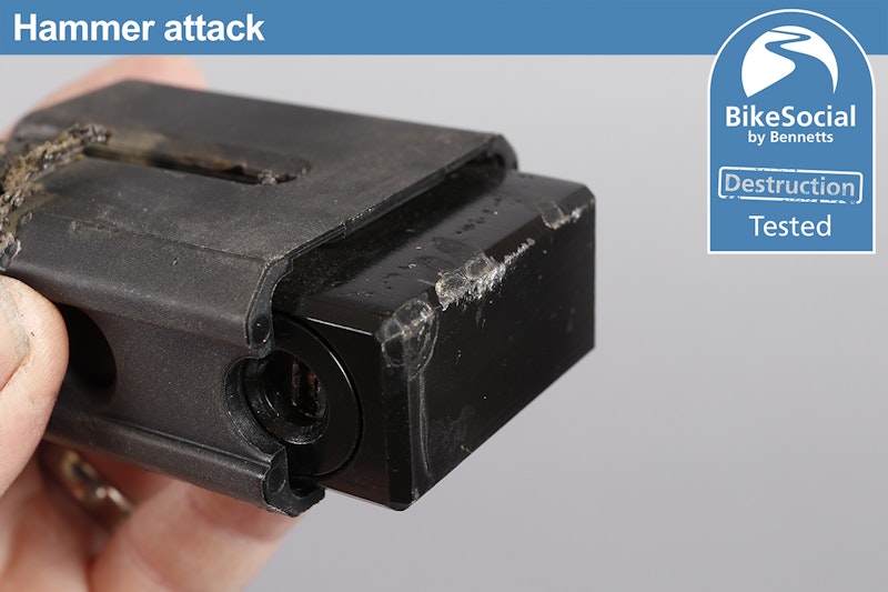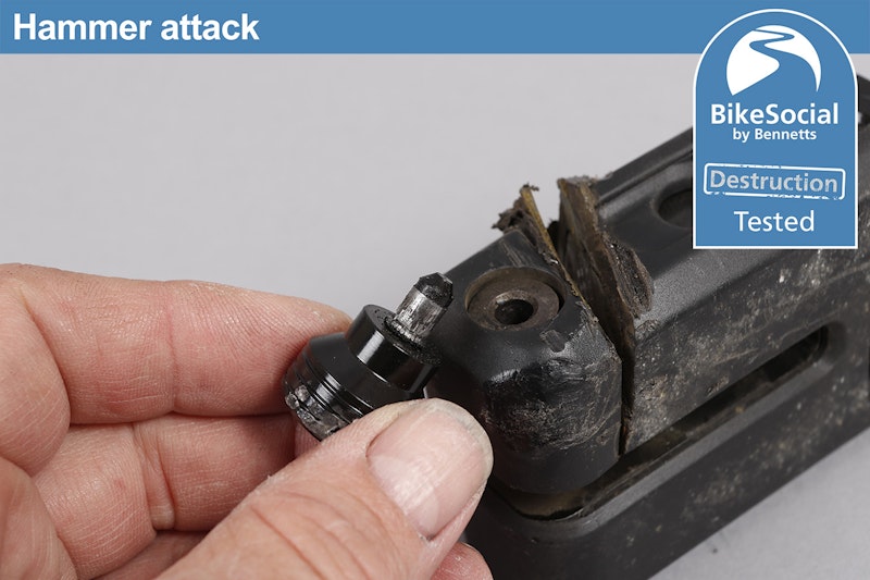 Despite knocking hell out of the Hiplok MD1000 with a sustained lump-hammer attack, it suffered nothing more than cosmetic damage with the bottom plastic cover flying off. The end of the locking pin also came off as it’s designed to be a very tight friction-fit but releases under severe attack in order to prevent it being an attack point, meaning there’s no way of pulling the pin out when it’s locked.