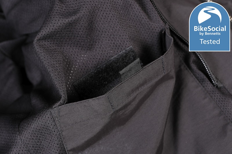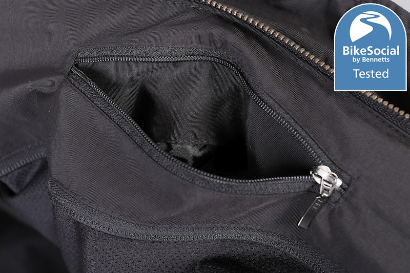 Lower down over the left of the waist is also a good-sized pocket with a Velcro fastening that’ll just about take a pair of lightweight summer gloves when you’re off the bike, or a bottle of water (though not with the Velcro fastened). If you have the thermal liner installed this pocket is covered, and there’s not one on the liner.